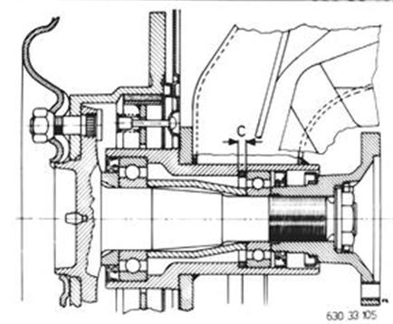 Calculate thickness of shims C. Example: ..A 63.5 mm (2.500´´) - B 58.6 mm (2.307´´) ________________ -------4.9 mm (0.193´´) - D...0.1 mm (0.004´´) ________________ ..C...4.8 mm (0.189´´) ================ D is specified axial play of 0.05 to 0.1 mm (0.002 to 0.004´´). | ![]() |