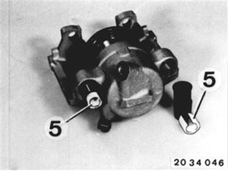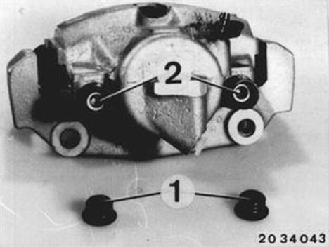 Vehicles after change point in 1982 OVERHAULING FRONT BRAKE CALIPER - USE REPAIR KIT - Remove and install front brake caliper 34 11 020. Pry off plastic caps (1). Unscrew guide bolts (2). Installation: Only clean guide bolts - don´t lubricate. Check guide bolts for condition, renew if necessary. Tightening torque*). 34 11 020 *) See Specifications