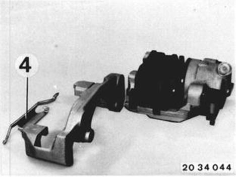 Disassemble caliper and remove brake pads. Installation: Push brake pads all the way out before installing spring (4). | ![]() |