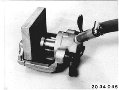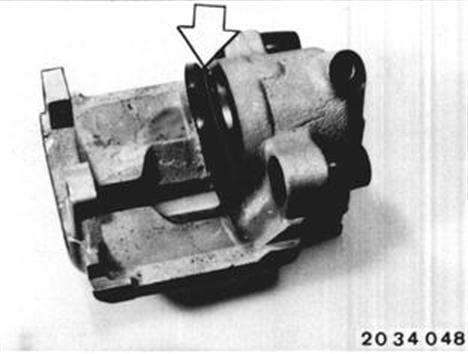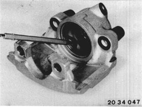 Place a liner made of hard wood, hard felt or Similar material in caliper recess for protection of piston. Press out piston with compressed air applied through connection bore. Caution! 10 bar (140 psi) air pressure is equal to a force of about 1250 N (275 lbs.). | ![]() |