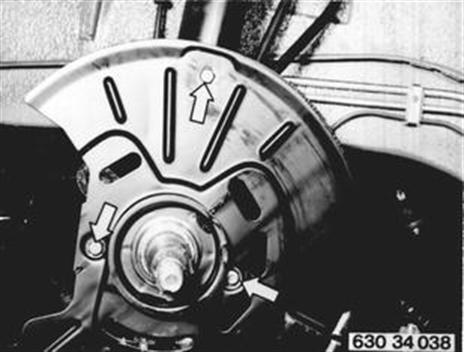 Vehicles before change point in 1982 REMOVING AND INSTALLING FRONT GUARD Remove and install wheel hub - 31 21 100. Unscrew bolt and take off guard. Installation: Tighten to specified torque¹). When replacing, make sure that only guards with vent slots are used. 31 21 100 ¹) See Specifications