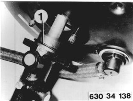 Remove and install air cleaner. Detach hoses at tandem master cylinder and tie them up. Important: Don´t spill fluid out of pipe elbow - remove carefully by pulling up. If rough treatment is applied, pipe could break in bend. Make sure that sealing plugs (6) fit properly in tandem master cylinder. Detach brake lines. 1 Front, right ............) 2 Front, left...............) 1st brake circuit 3 Rear wheel brakes) 4 Front, right.............) 5 Front, left...............) 2nd brake circuit Installation: Torque values¹). ¹) See Specifications