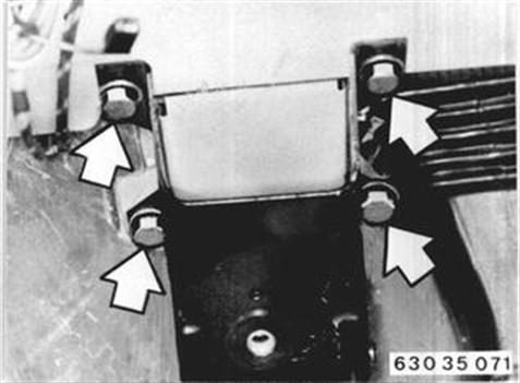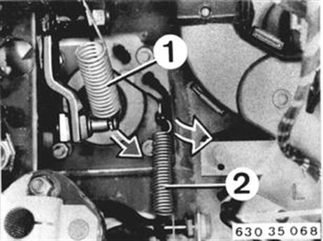 Vehicles after change point in 1982 REMOVING AND INSTALLING PEDAL BASE ASSEMBLY Remove complete steering column - see 32 31 090. Disconnect accelerator pedal return spring (2) and brake pedal return spring (1). 32 31 090