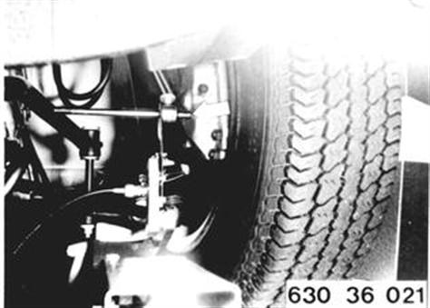ELECTRONIC BALANCING OF FRONT WHEEL ON CAR Always first balance wheels stationary (see 36 10 508) prior to electronic balancing. Check front wheel for lateral and radial runout 36 10 209. Check that wheel bearing play is adjusted correctly. Position measuring stand for balancing on control arm as close as possible to the wheel. Lift car with measuring stand. 36 10 508 36 10 209