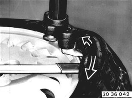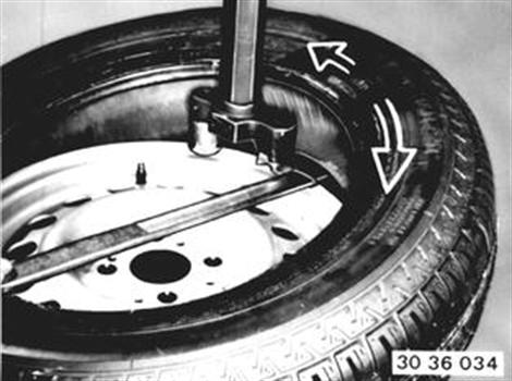 Vehicles after change point in 1982 REPLACING TIRE: Refer to operating instructions supplied with pertinent tire mounting machine for correct mounting of tires. However, also make sure that the machine is in perfect condition and that the wheel rim and tire are not damaged. General Tire Removing / Mounting Instructions. Removing Removal of a tire begins at the valve. After pressing the tire off of the rim flange, remove balance weights, press tire bead into well and coat thoroughly with tire mounting paste. Clean wheel rim thoroughly and inspect rim for damage before mounting the tire. The valve and valve insert must be replaced each time a tubeless tire is removed and installed. Because of a tight fitting tire, it could often be necessary to loosen the tire on the inside and outside by applying the pressing-off horn on the bead periphery at several points before pressing-off the tire.