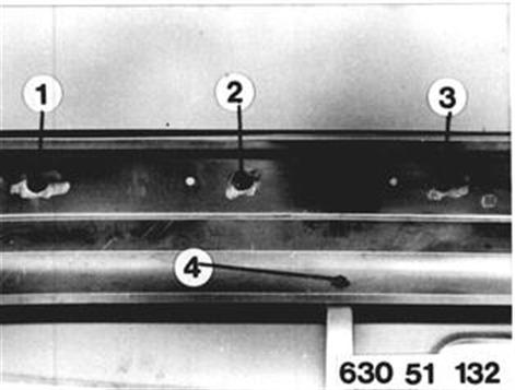 Vehicles after change point in 1982 REPLACING REAR BUMPER LOWER SECTION Remove rear bumper rubber guard 51 12 421. Unscrew nuts (1 ... 3) and bolt (4) on left and right sides. Remove rear bumper lower section. 51 12 421