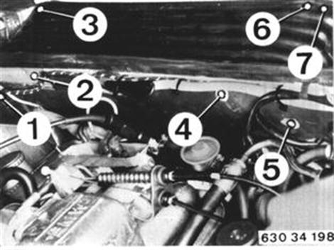 Unscrew bolts (1 ... 7). Detach trim. Pull wire harness through heater wall from engine compartment. Fold open hydraulic unit plug for this step. | ![]() |