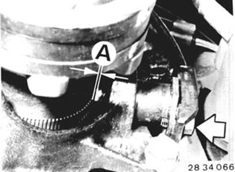 Vehicles after change point in 1982 REMOVING AND INSTALLING/ REPLACING ONE REAR PULSE (SPEED) SENSOR FOR ABS Turn off ignition. Remove rear wheel 36 10 300. Remove rear brake caliper 34 21 220. Unscrew socket head screw. Installation: Distance* between pulse sensor and pulse wheel (A) is given by design and cannot be adjusted. However, pulse wheel has to be visually inspected for dirt of damage. 36 10 300 34 21 220 * See Specifications