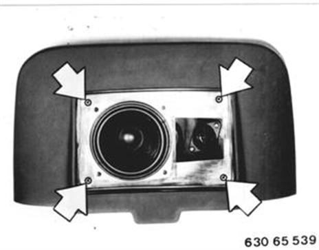 Vehicles after change point in 1982 REMOVING AND INSTALLING OR REPLACING REAR SPEAKERS (SOUND SYSTEM) Lift off speaker cover. Unscrew screws on speaker frame. Lift off speaker frame and disconnect plug. Installation: High pitch speakers must be directed toward inside of car.