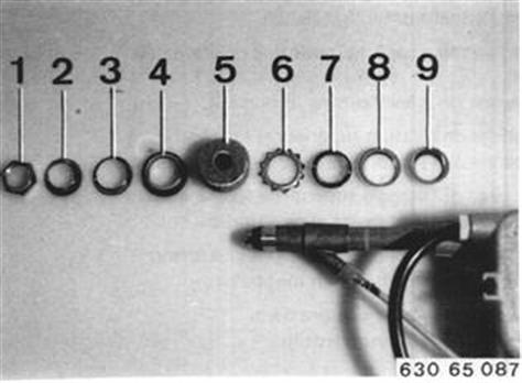 Install rubber grommets on antenna and control wires with their beads facing passenger compartment. Installed Order of Mounting Parts: 1 ... 4 outside on side panel. 5 ... 8 inside in wheel house Engage toothed ring (6) with two shoulders in openings of adapter (7). | ![]() |